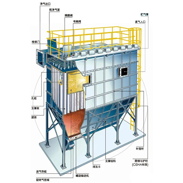 1、長袋離線脈沖袋式除塵器為箱體結(jié)構(gòu),主要由桁架、灰斗、中部箱體、上部箱體、噴吹裝置、梯子及平臺、進(jìn)出口風(fēng)管、PLC控制系統(tǒng)八部分組成。